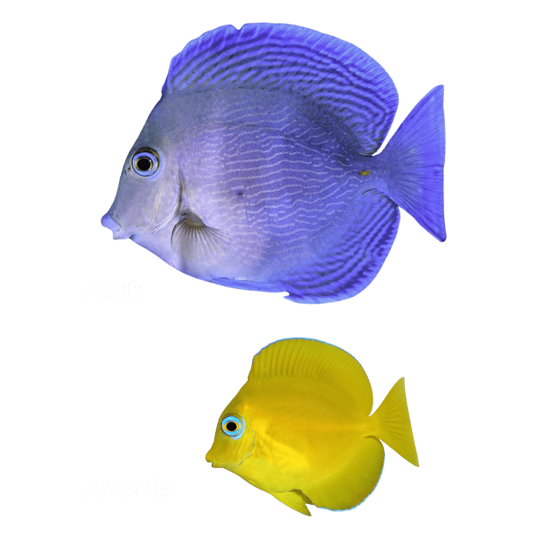 The Atlantic/Caribbean Blue Tang, known for its vibrant blue coloration, is a popular choice in saltwater aquariums. As juveniles, they start off yellow and gradually shift to a stunning blue with unique patterns as they mature. They are peaceful when young but can become more territorial as they grow.