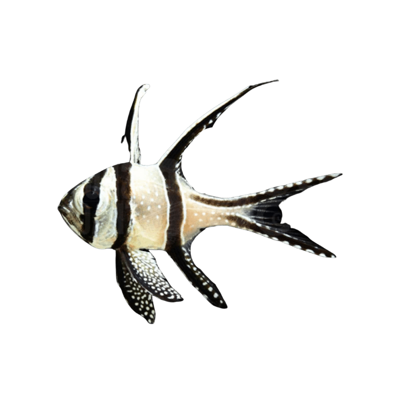 The Bangai Cardinal, renowned for its distinctive appearance, features a striking black and white coloration with long, flowing fins. Native to the Bangai Islands in Indonesia, this small fish is a favorite among aquarists for its peaceful nature and adaptability to reef environments.