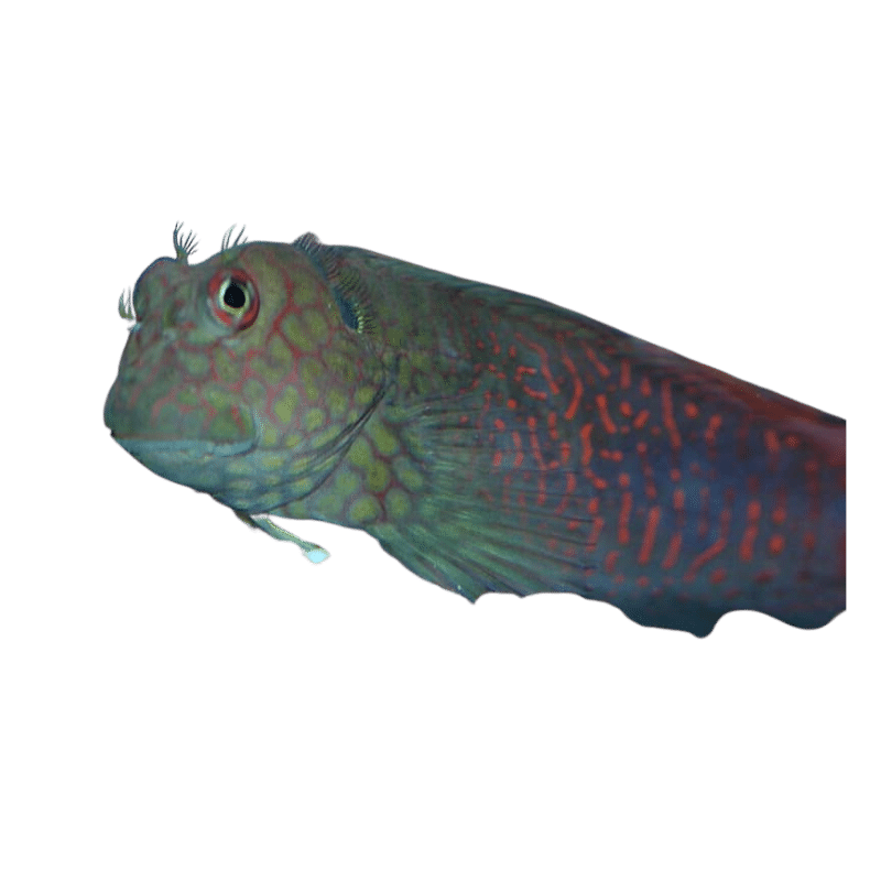 The Ember Blenny is a peaceful and colorful fish, showcasing a unique blend of green, red, and blue hues with red speckles across its body. Its eyelashes-like cirri give it a distinctive appearance, making it a popular choice for marine aquarists.