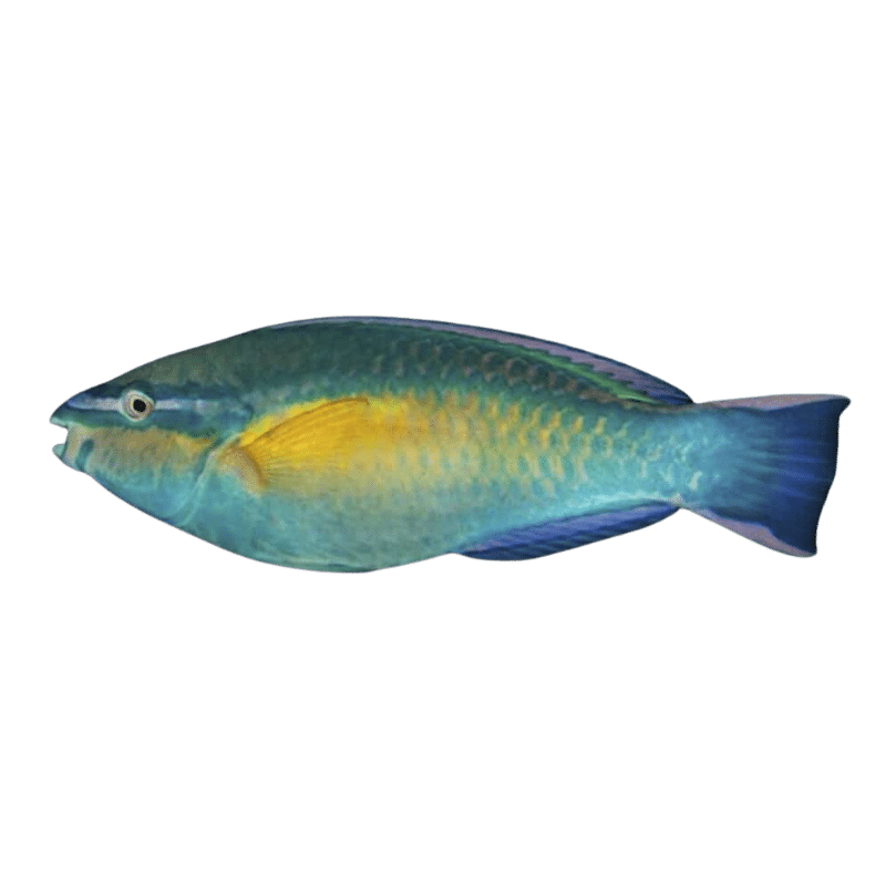 The Princess Parrotfish (Small) is a colorful addition to any marine aquarium, showcasing shades of green with subtle yellow and blue accents. A prominent blue stripe runs across its face, adding to its unique appearance. This fish is generally peaceful and thrives on a diet of algae, which helps maintain its vivid colors. While it may not be entirely reef-safe, it poses minimal risk to coral if adequately fed. It requires ample swimming space and live rock for grazing, making it a suitable choice for small to medium-sized saltwater tanks with stable parameters.